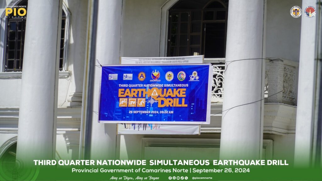 Sa pangunguna ng Provincial Disaster Risk Reduction and Management Office (PDRRMO), Bureau of Fire Protection (BFP) at Philippine National Police (PNP), isinagawa ang 3rd Quarter Nationwide Simultaneous Earthquake Drill sa Pamahalaang Panlalawigan ng Camarines Norte nitong ika-26 ng Setyembre, 2024 sa Provincial Capitol Grounds.