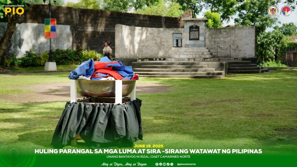 Sa unang bantayog ni Dr. Jose Rizal sa lilim ng mga mayayabong na punong talisay, ang mga delegado mula sa iba’t-ibang sangay ng pamahalaan ay tahimik na dumalo sa huling pagpupugay sa mga luma at sira-sirang watawat na isinagawa nitong ika-19 ng Hunyo sa Daet, Camarines Norte.
