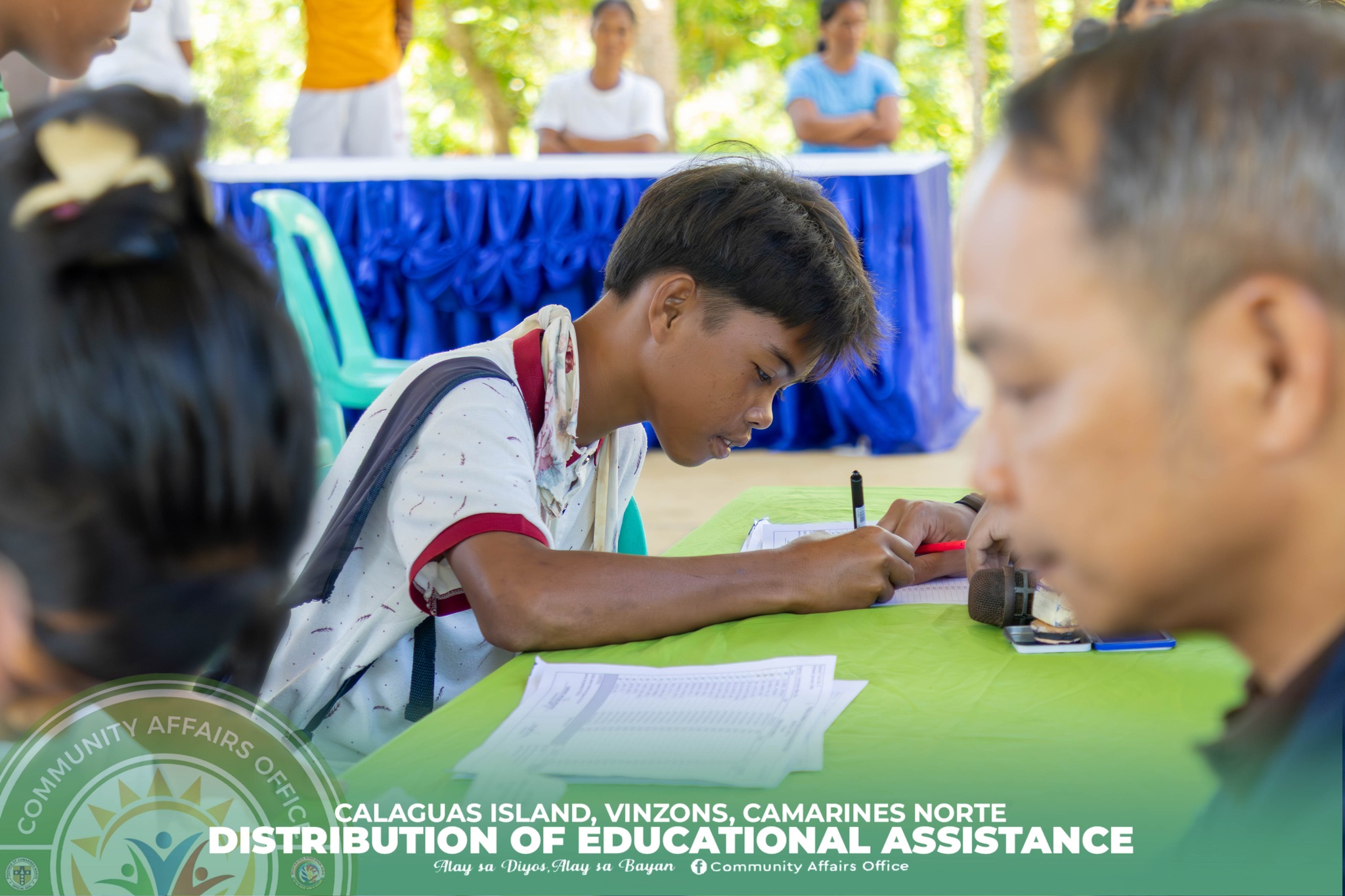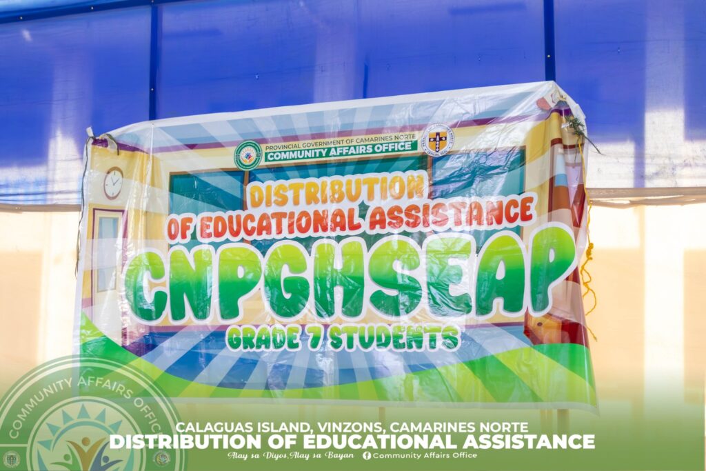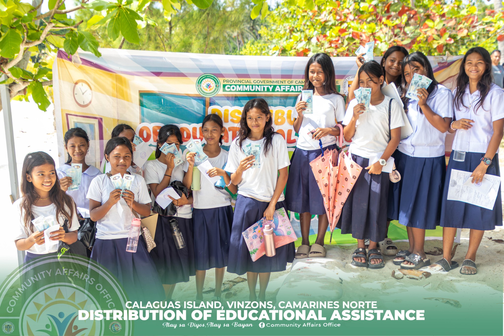 Pangunahing adhikain ng kasalukuyang administrasyon na mailapit ang mga serbisyong pang-edukasyon sa bawat mamamayan ng lalawigan ng Camarines Norte, lalo na sa mga komunidad na nasa malalayong lugar. Kaugnay nito, nagtungo ang tanggapan ng Community Affairs Office sa Calaguas Island, Municipality of Vinzons, Camarines Norte upang ipamahagi ang tulong pinansiyal para sa mga mag-aaral na Grade 7.